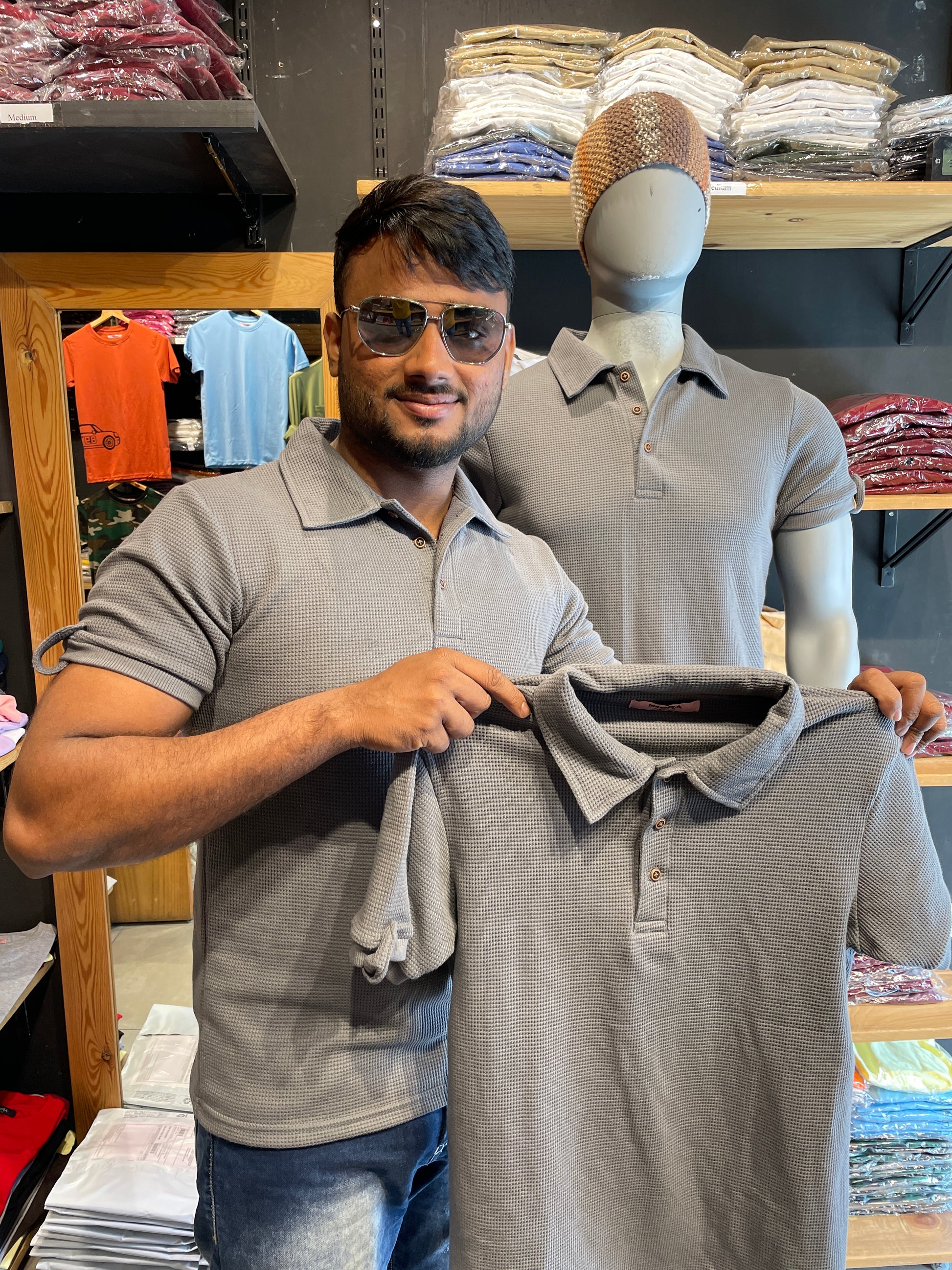 Dark Grey Waffle Collar Tee with Sleeve Rib and Loops